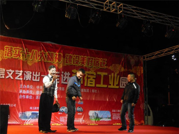 落實(shí)十八大精神 建設(shè)美好宿遷”服務(wù)基層文藝演出由市委宣傳部、宿遷報(bào)業(yè)傳媒集團(tuán)(報(bào)社)主辦,宿遷新聞網(wǎng)承辦,旨在深入宣傳黨的十八大和市委四屆三次全體(擴(kuò)大)會(huì)議精神,落實(shí)文化惠民措施,將走進(jìn)全市100余個(gè)鄉(xiāng)鎮(zhèn)、社區(qū),將包括歌舞、雜技、曲藝、戲劇等內(nèi)容的百場(chǎng)精彩演出奉獻(xiàn)給廣大基層群眾,此次受園區(qū)邀請(qǐng),專(zhuān)程赴園區(qū)公舍演出,為廣大工友及周邊居民帶來(lái)了一場(chǎng)精彩的文化大餐。
