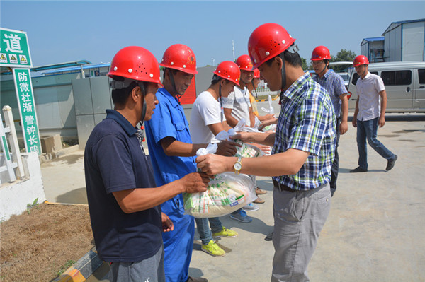 8月14日上午,開發(fā)公司副總裁劉建華帶隊(duì)來到園區(qū)派出所、夢(mèng)家園、許莊變、2014年市政二標(biāo)、生產(chǎn)力中心等項(xiàng)目工地,現(xiàn)場(chǎng)慰問奮戰(zhàn)在高溫一線的企業(yè)員工和建筑工人,并親自給他們遞上了毛巾、肥皂、洗發(fā)水、清涼油等防暑降溫物品。