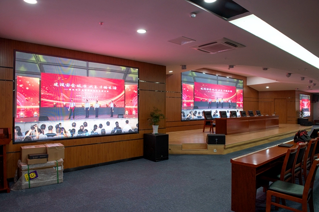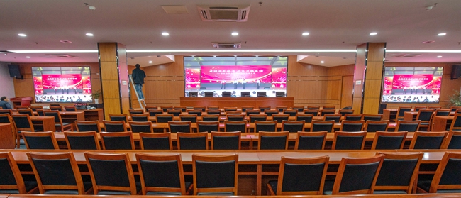 經(jīng)過改造,安全教育館新增3塊LED屏幕,其中主席臺處主LED顯示屏面積約20平方,東西兩側輔助LED顯示屏各約6平方。LED屏幕采用顯示單元像素間距為P2-2.5,具有顯示面積大、分辨率高、超高對比度、超寬視角、無縫拼接、維護方便等優(yōu)點。改造后進一步提升了視頻會議效果,增加了會場多功能性。