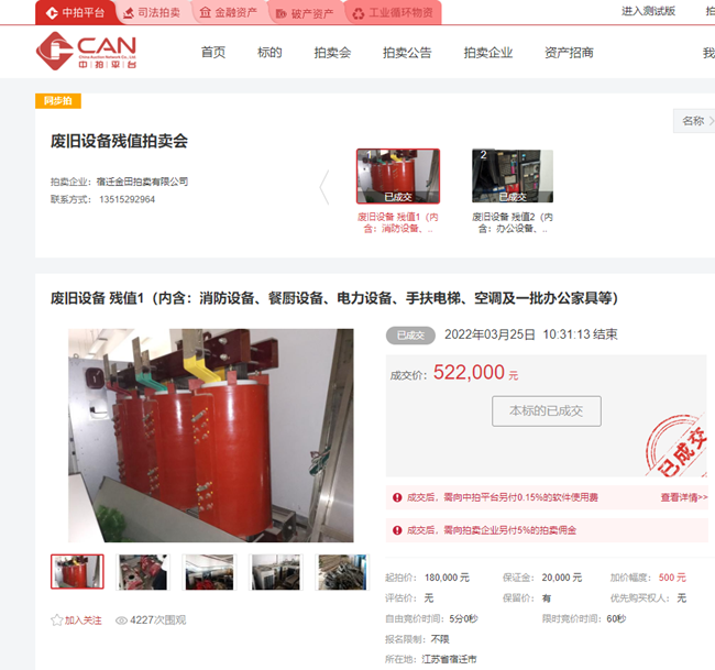 3月25日上午10時(shí),城發(fā)公司一批廢舊消防設(shè)備、餐廚設(shè)備、電力設(shè)備、手扶電梯、空調(diào)等物資在中拍平臺(tái)公開拍賣,經(jīng)過30分鐘的緊張激烈競(jìng)價(jià),最終以522000元成交標(biāo)的,比評(píng)估價(jià)180000元高出342000元,溢價(jià)率190%。