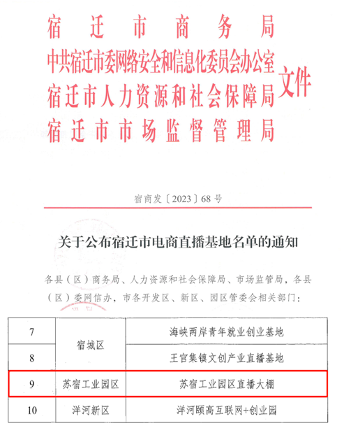 近日,由宿遷市商務局組織,各縣區(qū)參與的首批“宿遷市電商直播基地”評選結(jié)果揭曉,蘇宿電商園直播大棚成功入選首批“宿遷市電商直播基地”。