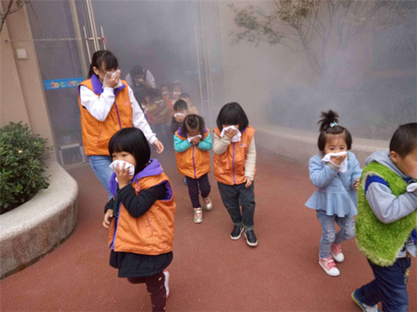 上午10點,消防演習正式開始,幼兒園里響起了緊急集合的報警聲。只見小朋友們在老師的指導下,雙手用濕毛巾捂著口鼻快速有序的從兩個樓梯和教室邊門逃生。在老師的帶領(lǐng)下歷時3分鐘就安全疏散到空曠的操場上,整個演練活動緊張有序。